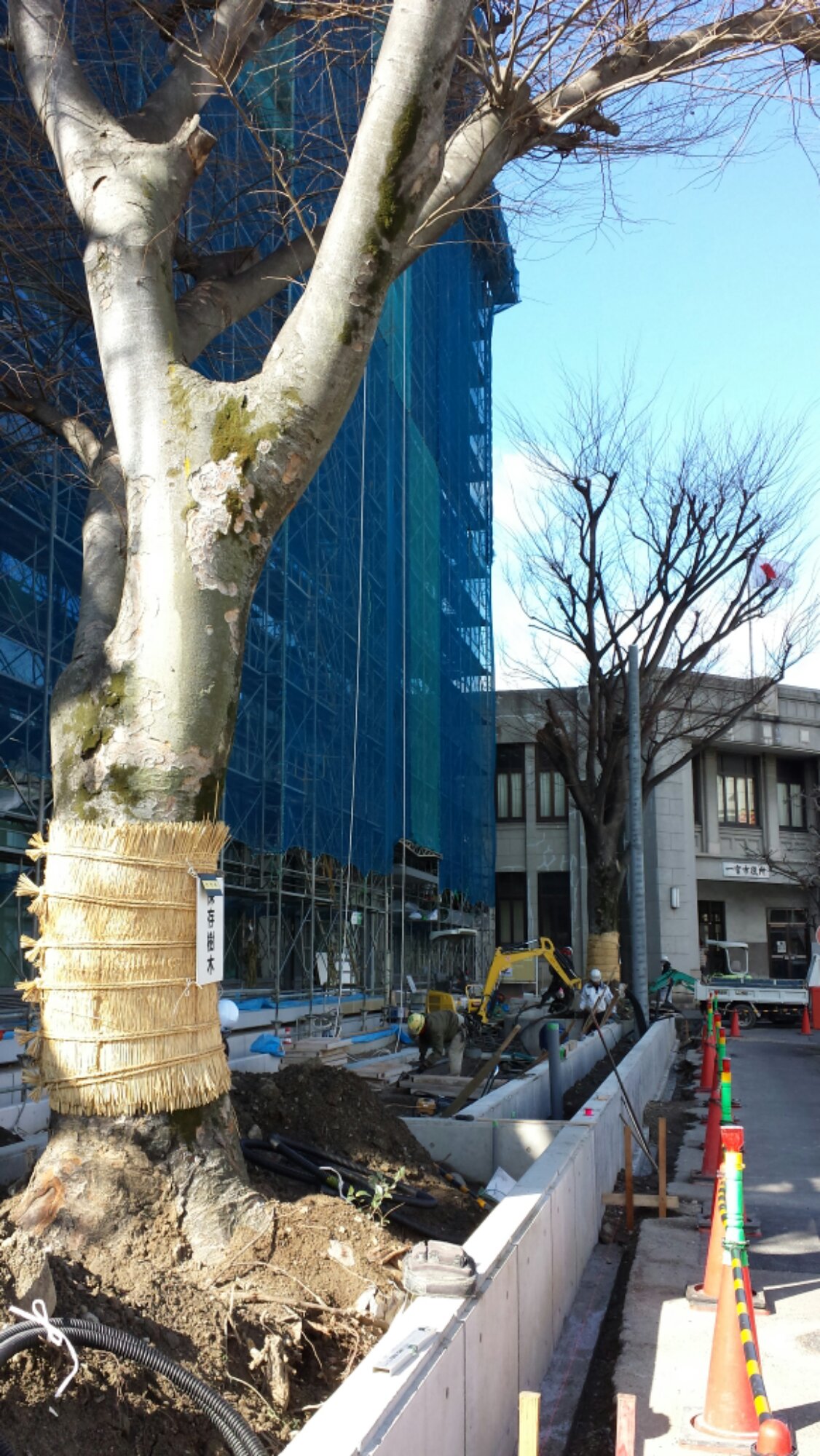 東側玄関の写真です。庁舎北側に保存樹木が2本残してあり、長年の歴史を感じさせられました。